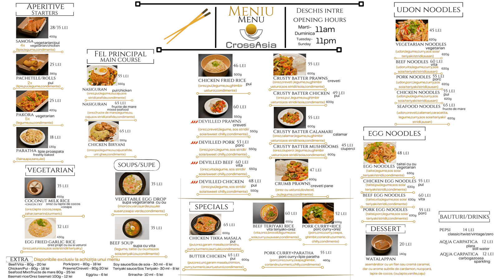 CrossAsia aduce în Tulcea aromele vibrante ale Asiei. Suntem pasionați de condimente autentice, tehnici rapide la wok și combinații proaspete. Te așteptăm în Adt Station, un loc accesibil și prietenos, să descoperi felurile noastre preferate din India, Sri Lanka, Thailanda și China.